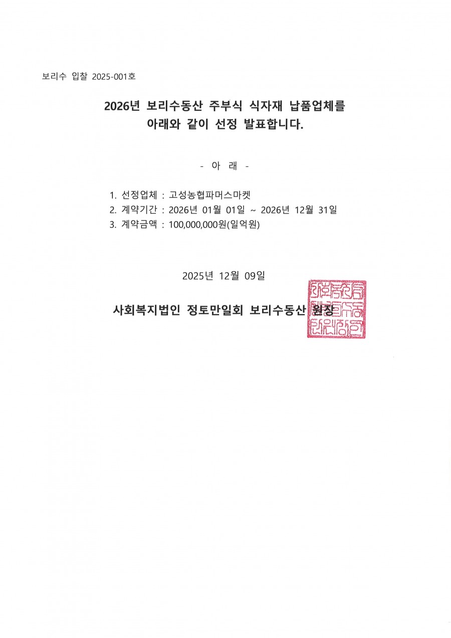 2026년 식자재 납품업체 입찰 결과 공고 > 공지사항