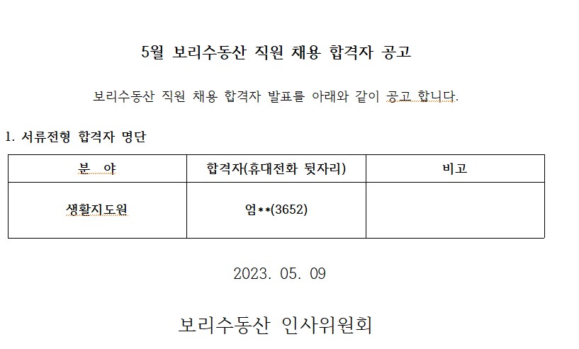 보리수동산 5월 채용면접 결과 발표 > 공지사항
