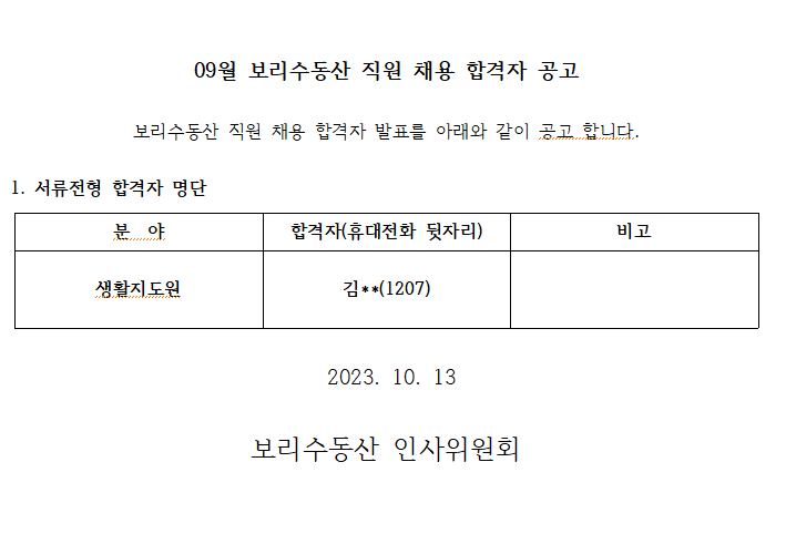 09월 보리수동산 신규종사자 채용면접 결과 발표 > 공지사항