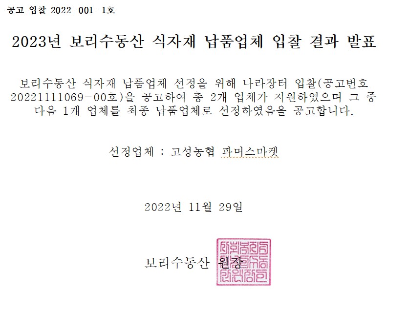 2023년 보리수동산 식자재 납품업체 입찰 결과 공고